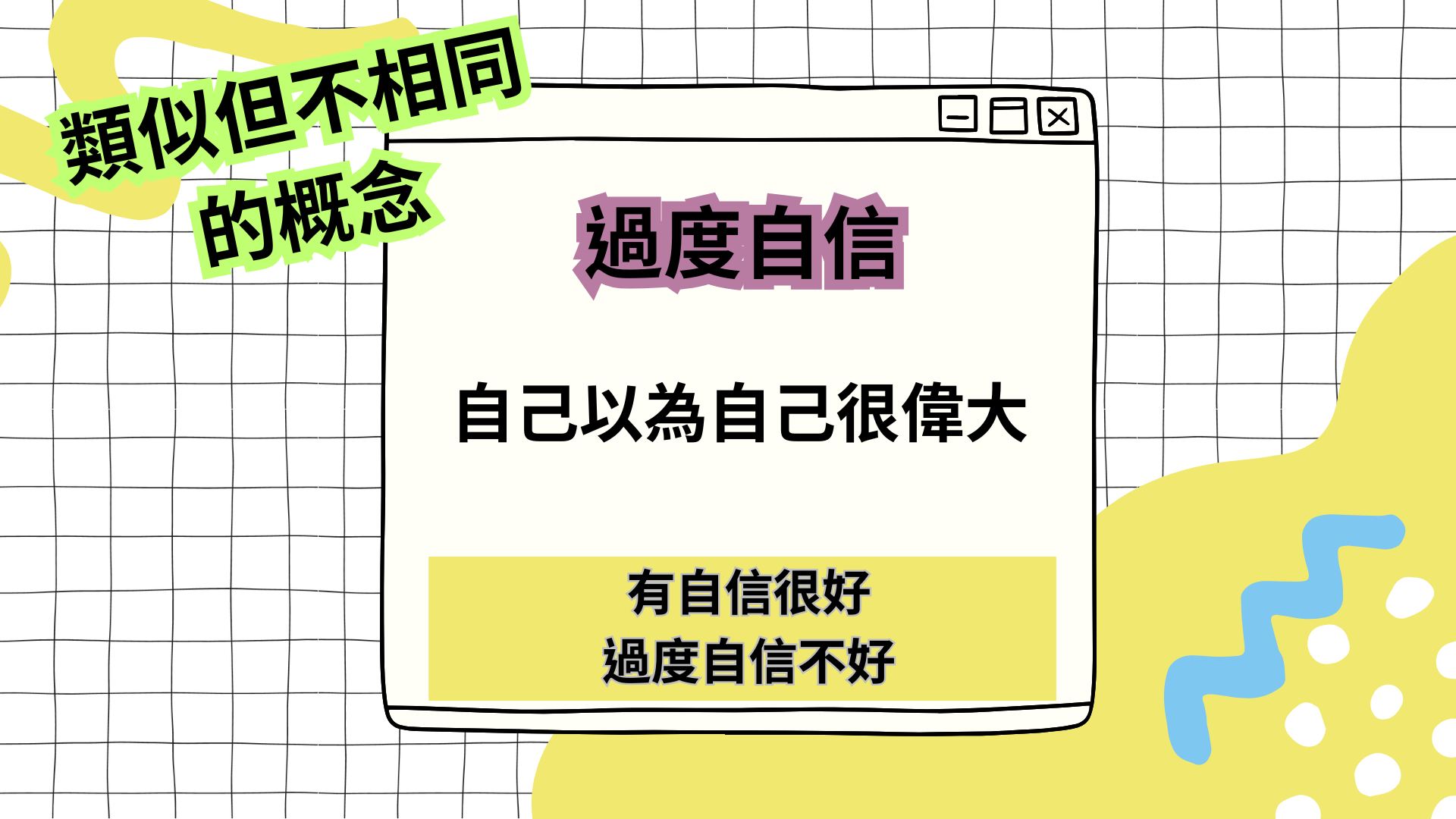 井底之蛙/夜郎自大這兩個成語強調的是因為「缺乏視野」與「缺乏社會比較」,不知道外界有多廣闊、別人有多厲害,從而產生自大心態。