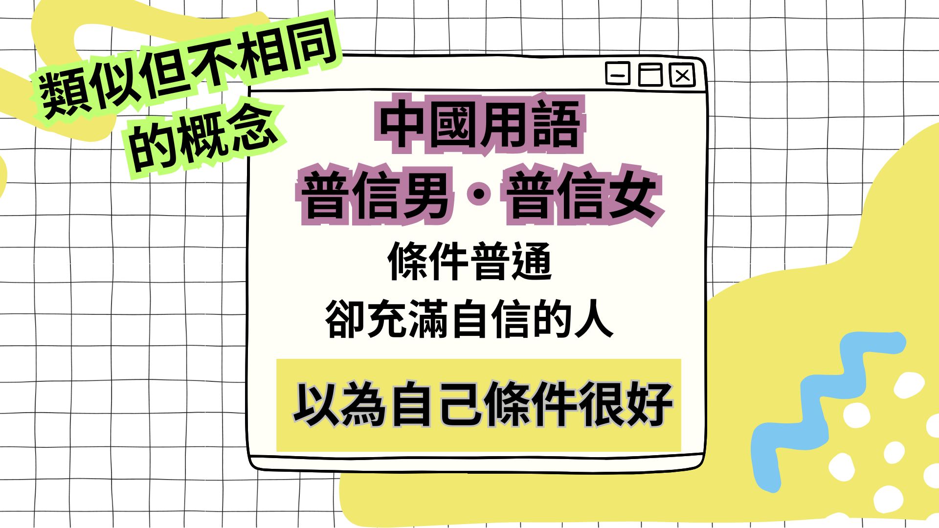 在我們的文化中,這種現象並不陌生,常被形容為「井底之蛙」或「夜郎自大」。近年來,網路上更出現了「普信男/女」這樣的詞彙,精準地描述了那些條件普通卻異常自信的個體。