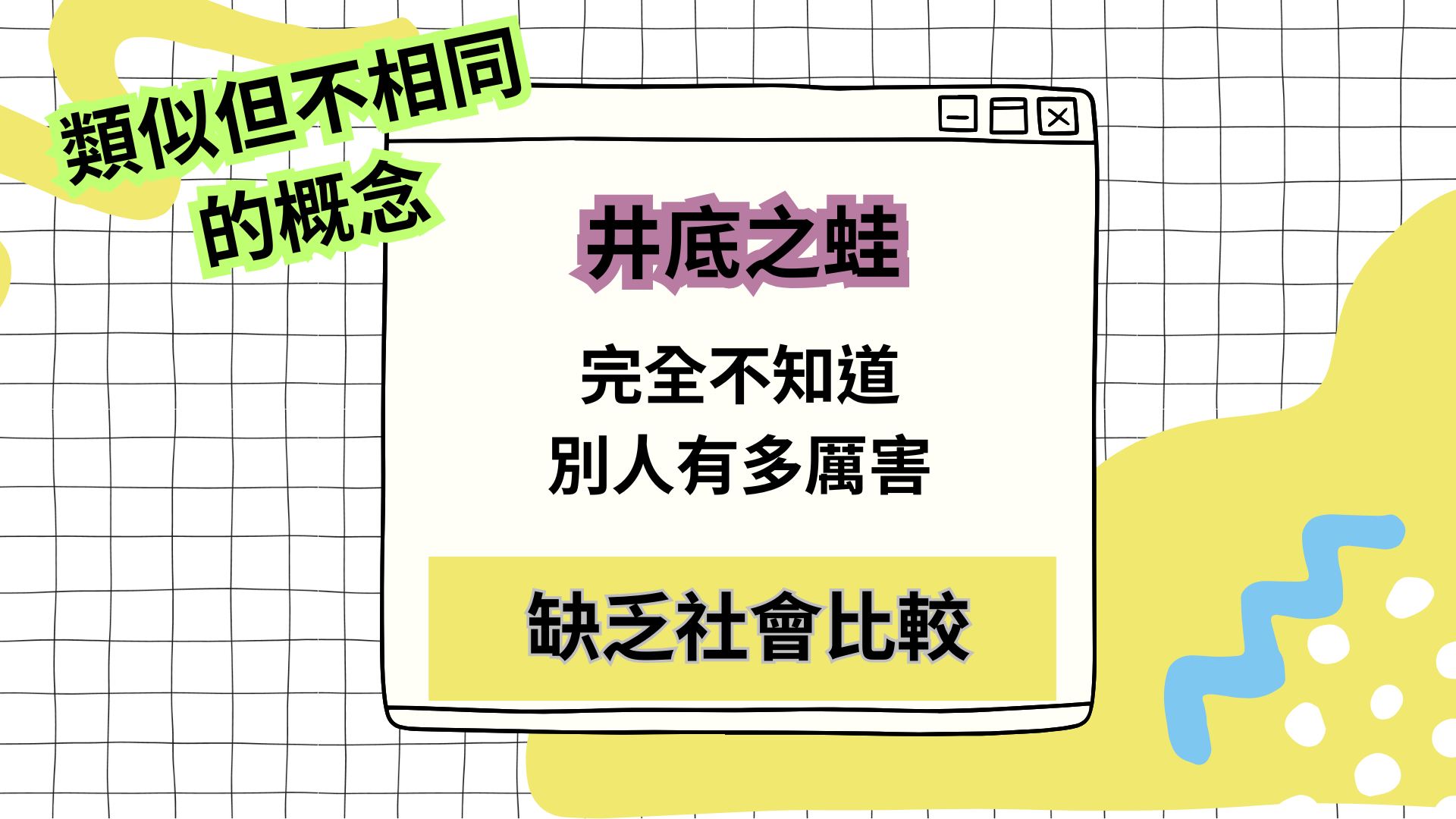 井底之蛙/夜郎自大: 「缺乏視野」與「缺乏社會比較」。