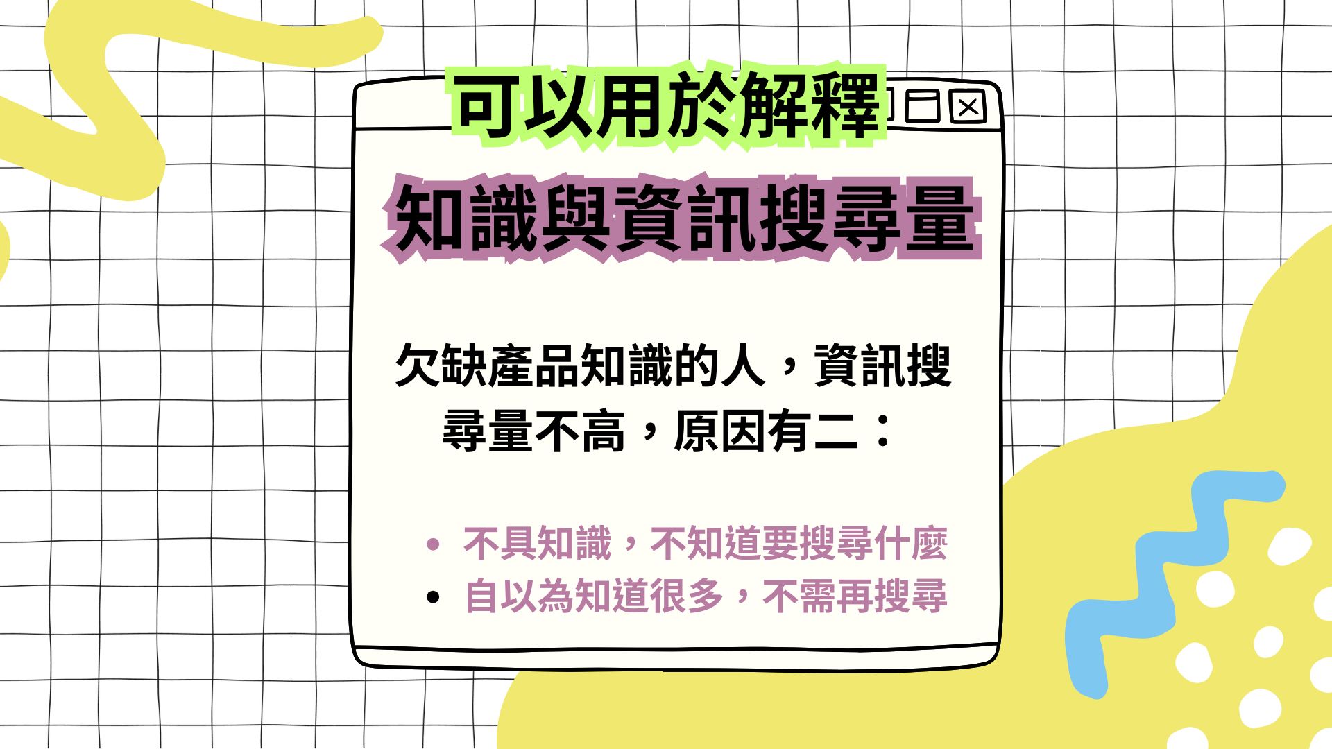 1. 不知道要搜尋什麼: 他們不具備足夠的基礎知識,因此連從何問起、該搜尋哪些關鍵字都不知道。